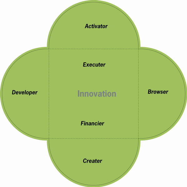 P.Fドラッカーは、経営とは「顧客の創造」と「イノベーション」といっているが、マーケティング学者のフィリップ・コトラーは、イノベーションを起こすためには、次のA〜Fの人材が必要だといっている。Activator アクティベーター:アイデアを思いつく人Browser ブラウザー:本当に創造的で刺激的なモノか吟味する人Creator クリエィター:試行可能なコンセプトに変える人Developer デベロッパー:ビジネスモデルに発展させる人Executor エグゼキューター:新製品や新事業を立ち上げる能力のある人Financier ファイナンサー:資金を供給できる人異質な能力を持った人の集合体が新しいものを創り出す。